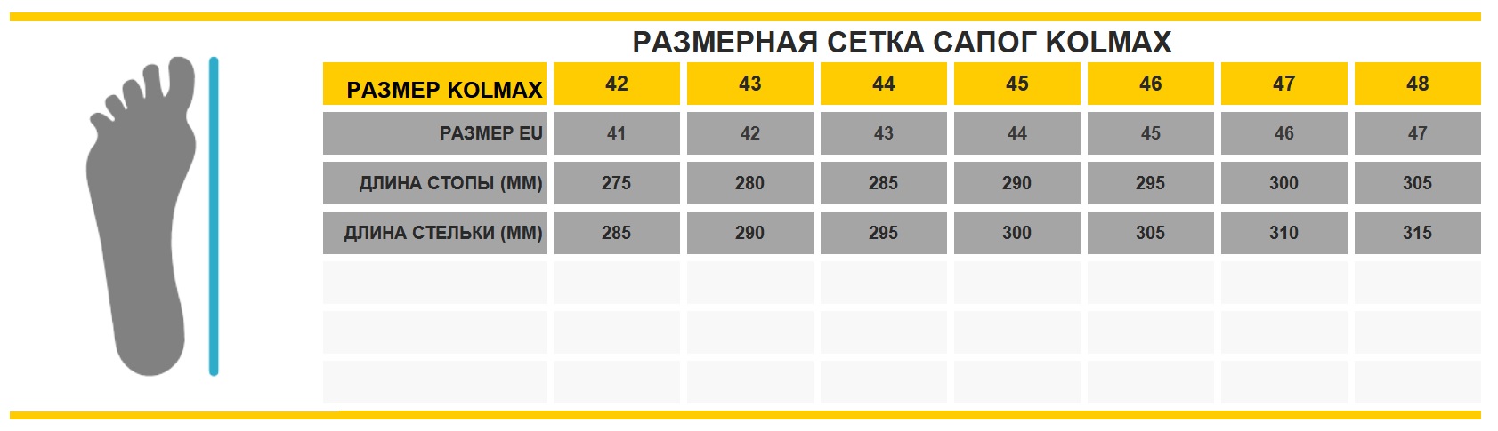 Kolmax Medium с затяжкой Сапоги компании Kolmax это современная обувь для рыбаков, охотников, фермеров и любителей активного отдыха. Сапоги предназначены для повседневной носки при температурах до -30°C. Кроме этого, обувь изготовлена из материала EVA, что придает изделиям амортизирующие свойства и эластичность при низких температурах. За счет вспененной структуры, материал EVA является отличным термоизолятором, сохраняя при этом невероятно легкий вес, всего 668 грамм – пара! Обувь 100% водонепроницаемая и обладает высокой износостойкостью. Сапоги для рыбалки Kolmax Medium имеют анатомическую форму и отлично сидят на ноге. Верхняя часть сапога дополнена защитным воротником с затяжкой, который препятствует попаданию снега внутрь сапога, даже при перемещении по глубоким сугробам. Каждая пара комплектуется теплым войлочным вкладышем, благодаря чему их можно очень легко очистить от грязи и быстро просушить. Вкладыш имеет надежные швы, благодаря чему не сползает и хорошо держит форму во время эксплуатации. При выборе зимних сапог для охоты и рыбалки Kolmax нужно учитывать, что размер указан без учета вкладыша, поэтому необходимо выбирать сапоги на один размер больше, чем Вы носите обычно.