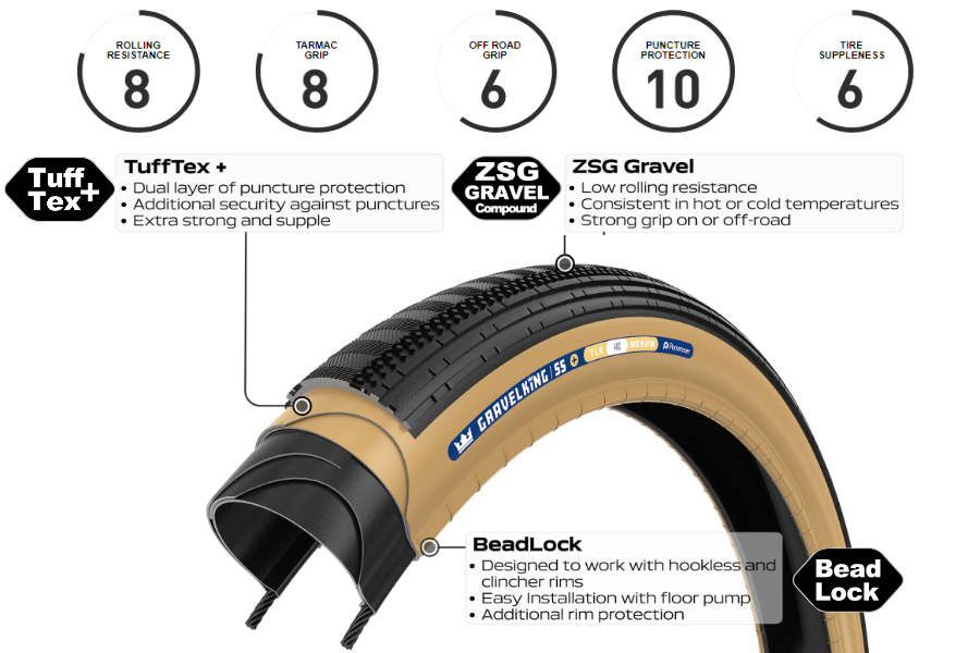 Компаунд ZSG Gravel (Zero Slip Grip Gravel) обеспечивает низкое сопротивление качению, в то же время сохраняя оптимальный уровень сцепления с различными видами покрытия - от асфальта до крупного, или наоборот, мелкого сыпучего гравия. Кроме того, он чрезвычайно стойкий к температурным колебаниям и не теряет своих свойств ни на раскаленном асфальте, ни на зимних мерзлых тропах.