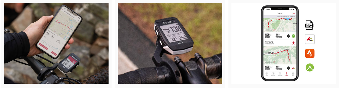- Сохраненные маршруты. Импортируйте созданные ранее маршруты в приложение Sigma Ride или на само устройство с сервисов типа Strava и Komoot, или в виде файлов с форматом gpx. Память ROX 11.1 EVO вмещает до 36 треков;