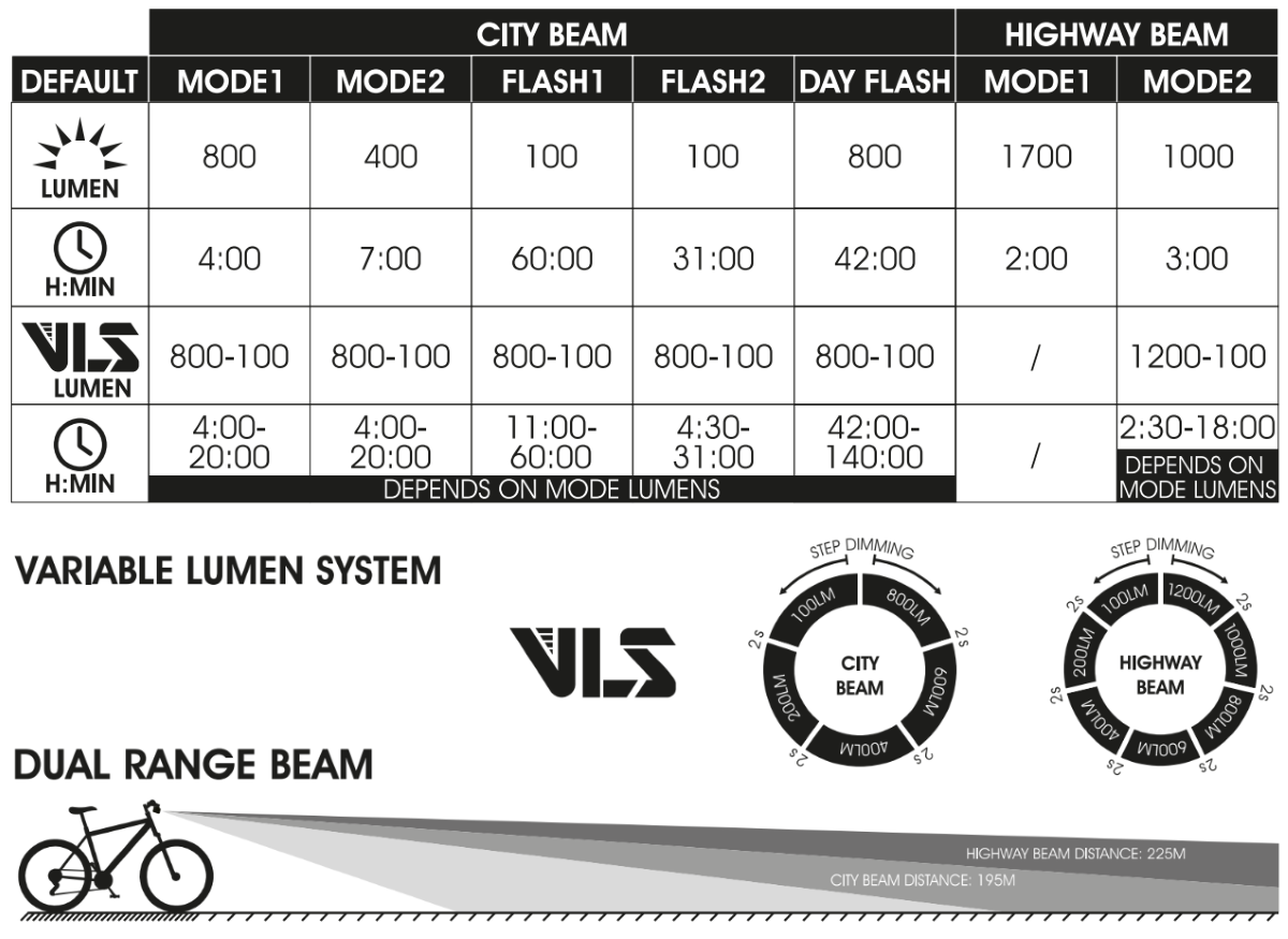 - Режими VLS – налаштування яскравості режимів (крім максимального);