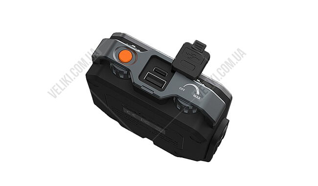 Сердце устройства – встроенный аккумулятор емкостью 10000 мАч, который заряжается с 0% до 100% за 4 часа с помощью зарядного кабеля USB Type-C из комплекта. Фонарь способен выполнять функции Power Bank: для этого в корпусе присутствует выходной порт USB-A для подзарядки мелкой техники, включая смартфон и планшет. Порты закрываются заглушкой, которая предотвращает попадание внутрь влаги и мелких загрязнений.