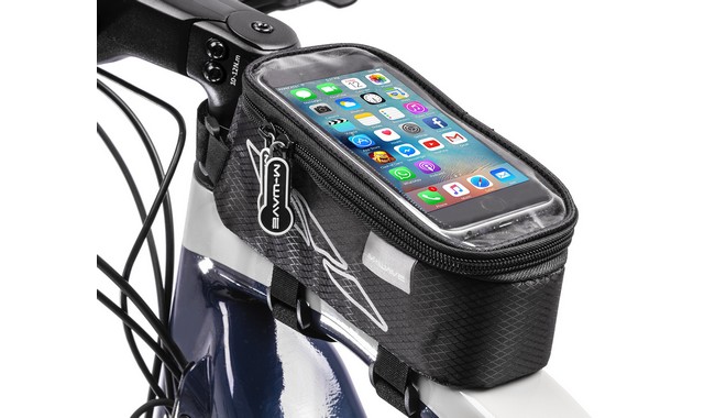 Сумка на раму M-Wave Rotterdam Top L - зручна та містка велосумка з відділенням для смартфона, що встановлюється на верхню трубу рами. Посилене дно та м'яка вставка, що поглинає вібрацію, забезпечують безпечне транспортування речей усередині. Основне відділення (17 x 8 x 8 см) розділене сіткою для зручності розміщення речей. Спеціальна плівка розроблена для роботи зі смартфонами, а сама сумка виготовлена із вологозахисного матеріалу.