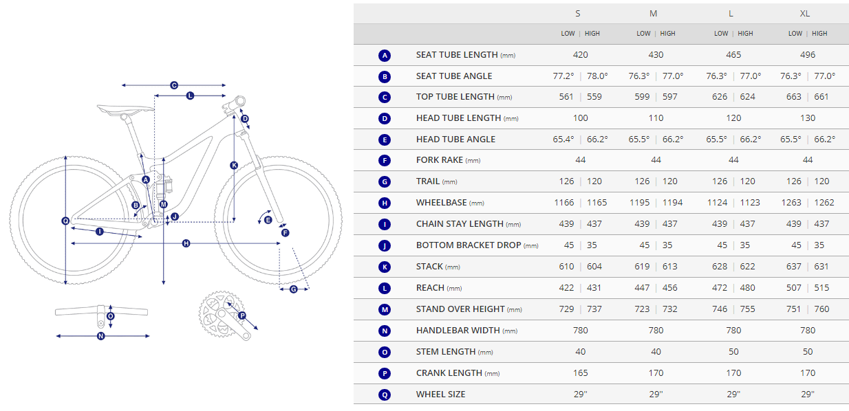 Вы можете выбрать более крутые или менее крутые углы рулевой трубы/сиденья и понижение центра каретки на 35 мм или 45 мм, чтобы настроить управляемость под свой стиль катания и тип местности.