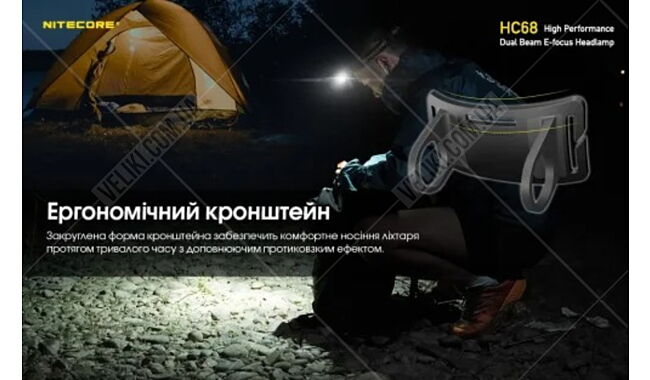 Ліхтар Nitecore HC68 - неймовірно потужна модель налобного ліхтаря має унікальну функцію електронного фокусування випромінюваного потоку світла. Представлена модель налобного ліхтаря виконана відповідно до сучасних міжнародних стандартів безпеки та інноваційних технологій, що робить з ліхтаря пристрій для всіляких умов експлуатації. Ліхтар можна використовувати на час пошукових рятувальних операцій, трекінгу, пішого туризму, спелеології та різного промислового обслуговування обладнання.