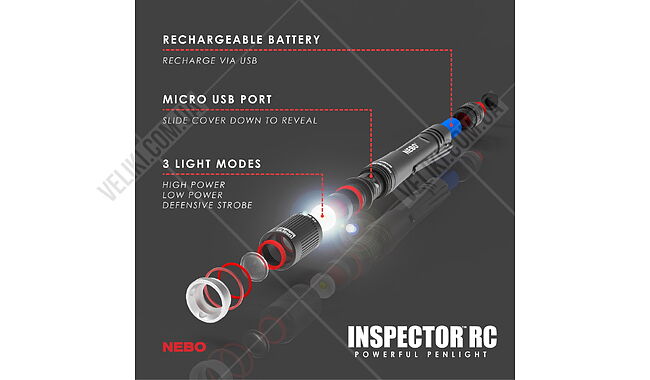 Ліхтар Nebo Inspector RC - це потужний водонепроникний (IP67) ліхтарик-ручка зі світловим потоком 360 люмен. INSPECTOR™ RC має функцію FLEX-POWER та оснащений знімним сталевим затискачем, 4-кратним зумом та 3 режимами освітлення (високий, низький, стробоскоп) та технологією Soft-Touch, яка забезпечує миттєве спрацювання при вимкненому світлі легким дотиком. кнопки.