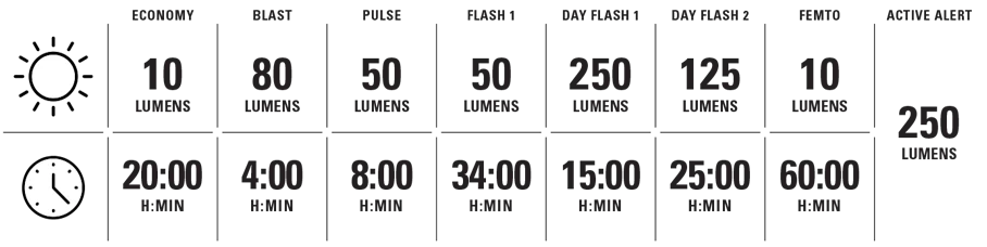Мигалка оснащена 10 сверхъяркими светодиодами, обеспечивающими оптимальную форму луча для рассеивания света даже в самых сложных условиях. и имеет семь режимов работы различной интенсивности - от привлекающих внимание режимов Active Alert (250 люмен) и Day Flash (250 люмен) до впечатляющих 60 часов работы в режиме Femto. Saddle Ai Alert оснащен аккумулятором емкостью 1100 мАч, просто открутите