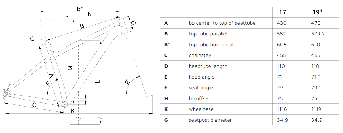 Рама, изготовленная из алюминиевого сплава, обладает небольшим весом, который облегчает процесс управления и транспортировки велосипеда вручную. Повышенная жесткость эффективно трансформирует усилие велосипедиста в скоростной режим. Слегка заниженная рама облегчает прохождение сложных участков трассы. Трансмиссионные тросы проведены с внешней стороны верхней трубы рамы, за счет этого они подвержены негативному влиянию воды и грязи, что может существенно сократить их ресурс, во избежание этого придется чаще проводить технический осмотр.